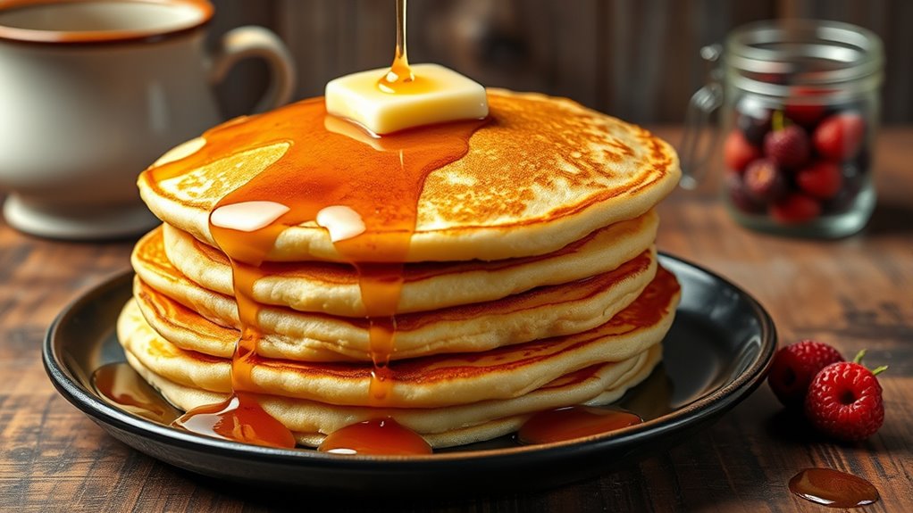 To really perfect your pancakes, pay attention to how toppings are presented. Arrange fruit artfully on top, and don’t skimp on the toppings—these finishing touches can make even the simplest pancake look gourmet. When choosing toppings, think about balance: if your syrup variation is intensely flavored, keep the toppings lighter, like fresh berries or a sprig of mint. Conversely, if you go for a more neutral syrup, you can indulge in richer toppings like chocolate chips or caramelized nuts. Remember, the goal is to create a well-rounded bite every time. By carefully selecting and layering syrup variations and toppings choices, you transform ordinary pancakes into a memorable breakfast experience. With a little experimentation, you’ll find your perfect combination that satisfies your taste buds and impresses anyone you serve them to.
