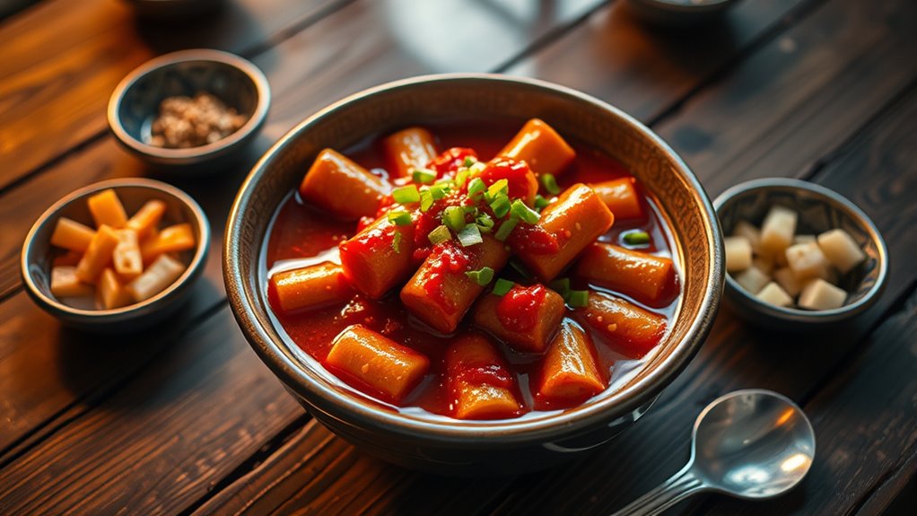 To make Korean tteokbokki at home, start with rice cakes and cook them in a spicy gochujang-based sauce, which you can customize with fish cakes, boiled eggs, or regional ingredients like seafood or cheese. Adjust the spice level with gochujang or gochugaru, and add sugar or honey for a sweeter touch. This street food’s versatility lets you craft flavors to suit your taste—there’s more to explore if you keep going!