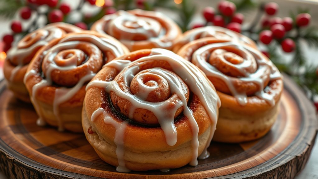 On Christmas morning, baking warm cinnamon rolls fills your home with a delightful aroma of cinnamon, butter, and sweet dough, creating an inviting festive atmosphere. You’ll start by mixing high-quality ingredients, letting the dough rise until fluffy, then rolling it out, spreading butter and cinnamon-sugar, and cutting into even pieces before baking to golden perfection. Topped with cream cheese glaze, these rolls make your holiday breakfast unforgettable. If you keep exploring, you’ll discover tips for perfecting your cinnamon rolls every time.
