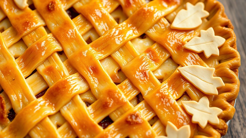 Imagine your pie as a garden where every plant needs nourishing soil. Yes, you can craft vegan decorative pie crusts using vegan butter alternatives, which serve as the fertile ground for creativity. For added shine, brush with fruit-based glazes instead of egg washes. These options let you create charming lattice or cut-out designs that are both beautiful and compassionate, ensuring your pie’s appearance matches your values.