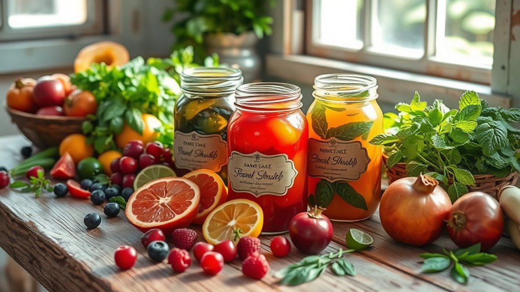 To make seasonal shrubs with local produce, start by selecting fresh, in-season fruits and herbs from farmers’ markets or CSA programs. Combine these with sugar and let them macerate for several hours or overnight to extract maximum flavor. Strain out solids and add vinegar or alcohol for preservation. This approach supports sustainability and highlights the natural flavors of your region. Keep exploring to discover tips that will help you craft vibrant, delicious shrubs year-round.