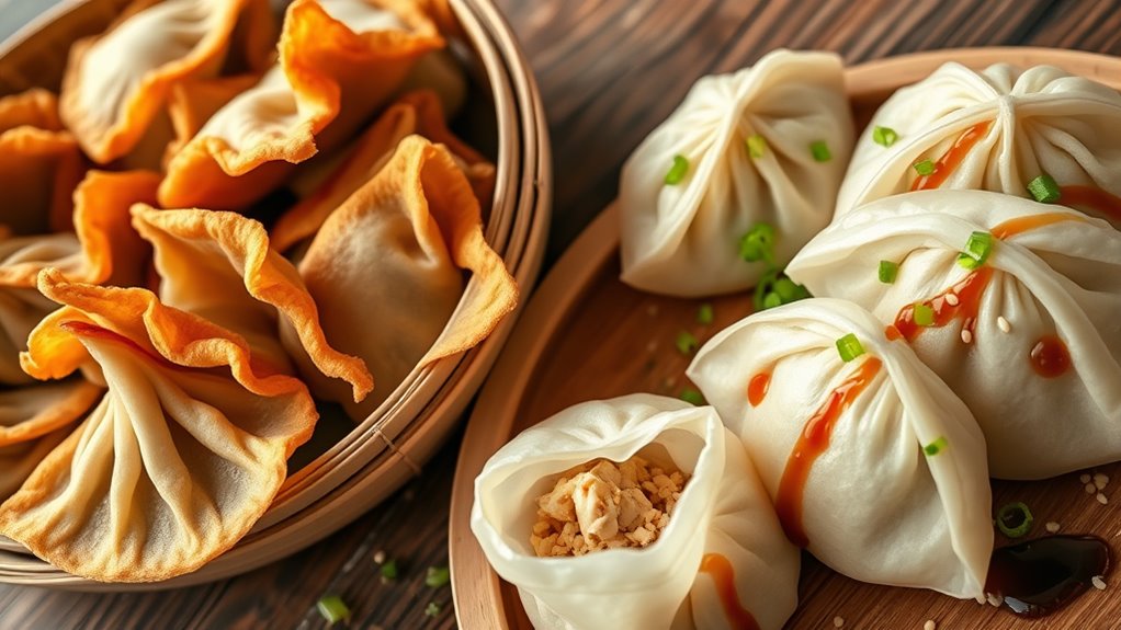 Are you curious about the art of making Chinese dumplings? If so, you’re about to discover a world of flavors and techniques that make these bite-sized delights so irresistible. One of the most exciting parts of making dumplings is exploring dumpling filling variations. You can get creative with ingredients, mixing ground pork, chicken, beef, or even seafood with vegetables like cabbage, scallions, mushrooms, or carrots. For a vegetarian option, try combining tofu with fresh greens and herbs. The key is balancing flavors—adding ginger, garlic, soy sauce, sesame oil, or even a splash of rice vinegar can elevate your fillings. Once you’ve settled on your ingredients, the next step is mastering the cooking techniques that bring these fillings to life. You might steam, boil, pan-fry, or even deep-fry your dumplings, each method offering a distinct texture and flavor. Steaming keeps the dumplings tender and moist, perfect for delicate fillings like fish or vegetable mixes. Boiling is quick and straightforward, creating soft, juicy dumplings ideal for soups or dipping sauces. Pan-frying, especially for potstickers, gives you that crispy bottom with a tender top—this technique requires a bit of skill but results in a satisfying contrast in textures. To achieve that perfect golden crust, you start by frying the dumplings in a hot pan with a little oil, then add water to steam them until cooked through, finishing with a brief fry to crisp the bottoms. Deep-frying offers a crunchy exterior, turning your dumplings into a snack akin to Chinese fried wontons. Whichever technique you choose, make sure not to overcrowd the pan, and keep the heat steady to prevent burning or uneven cooking. When making dumplings, wrapping skills are just as important as filling choices. Use a thin, round wrapper and gently pleat the edges to seal in the delicious stuffing. Practice makes perfect—don’t worry if your first few attempts aren’t flawless. The beauty of making dumplings at home is that you can customize everything to your taste, from the fillings to the cooking method. If you want to enhance the experience, consider using a specialized equipment like a bamboo steamer or a non-stick pan designed for dumplings. As you get more comfortable, experiment with different flavor combinations and techniques to discover your favorite style. Whether you prefer soft, steaming dumplings or crispy, pan-fried ones, the process is rewarding and allows you to connect with a centuries-old culinary tradition. So gather your ingredients, sharpen your skills, and enjoy the wonderful journey of creating Chinese dumplings tailored perfectly to your palate.
