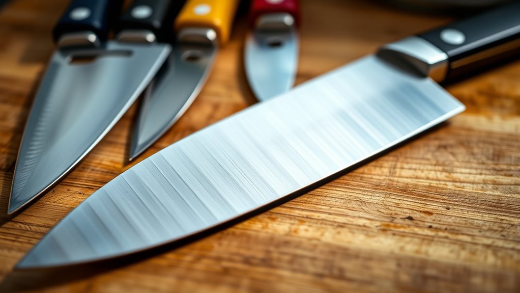 You should look for blade materials like high-carbon stainless steel, VG-10, or Damasus steel, as they offer excellent durability. These materials resist rust and maintain sharpness longer, making them ideal for everyday use. Durability factors include hardness, corrosion resistance, and edge retention. By choosing knives with these blade materials, you guarantee your knives stay sharp and sturdy through frequent use, saving you time and effort in the kitchen.