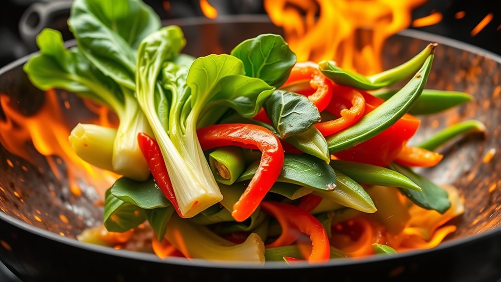 To master stir-fry, focus on making a balanced, flavorful sauce with soy, oyster, rice vinegar, sesame oil, and cornstarch for shine and coating. Properly seasoning your wok develops wok hei, adding smoky depth and preventing sticking. Keep the heat high and ingredients moving quickly for authentic flavor and aroma. If you want to open up more tips and techniques for achieving perfect sauces and wok flavor, there’s plenty more to discover.