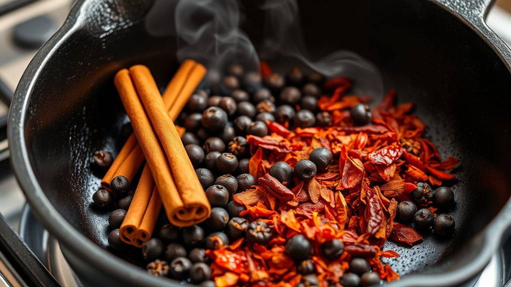 To boost your spice aroma, start by heating a dry skillet over medium heat. Add your spices and stir constantly to prevent burning. Look for fragrant smell, slight darkening, or popping sounds as signs of readiness. Remove from heat promptly and let them cool before grinding or using whole. Proper toasting enhances flavor, releases essential oils, and boosts health benefits. Keep practicing, and you’ll discover more tips to make your spices truly flavorful.