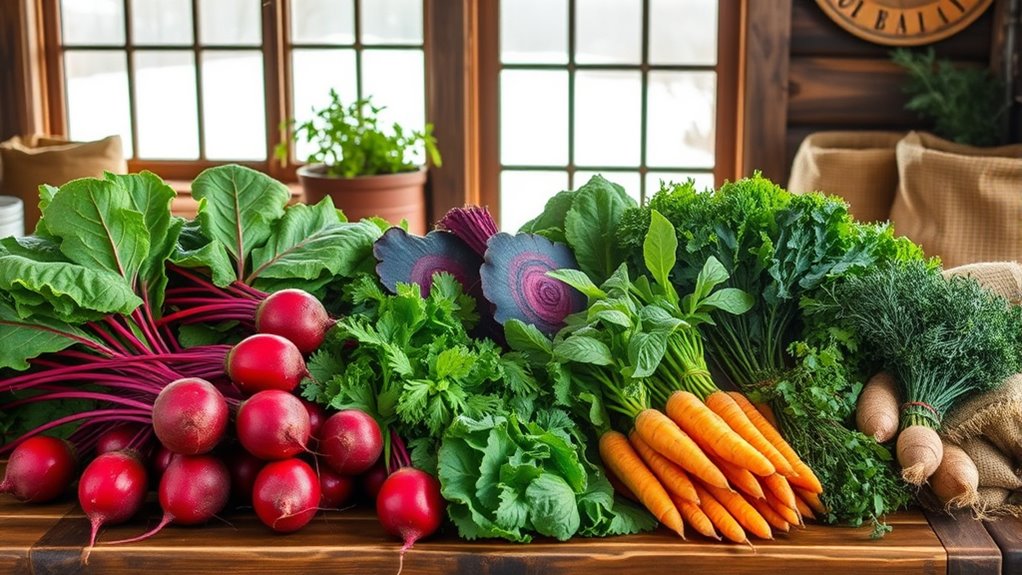 Think of your winter produce as treasure waiting to be uncovered. To keep it fresh, use a root cellar for cool, dark storage—perfect for carrots, potatoes, and beets. For leafy greens and herbs, employ freezing techniques by blanching first, then storing in airtight containers. These methods preserve flavor and nutrients, ensuring you enjoy farm-fresh goodness all winter long. Proper storage transforms your home into a winter farm oasis.