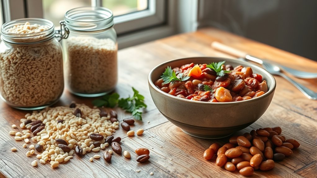 To enhance the flavor of simple bean and grain dishes, try spice blending and herb infusions. Mix in a pinch of cumin, paprika, or chili powder to add warmth and depth. Fresh herbs like cilantro, parsley, or basil brighten the dish, while infusing oils with garlic or lemon can elevate the taste. Experimenting with these techniques makes your meals more vibrant without extra effort or cost.