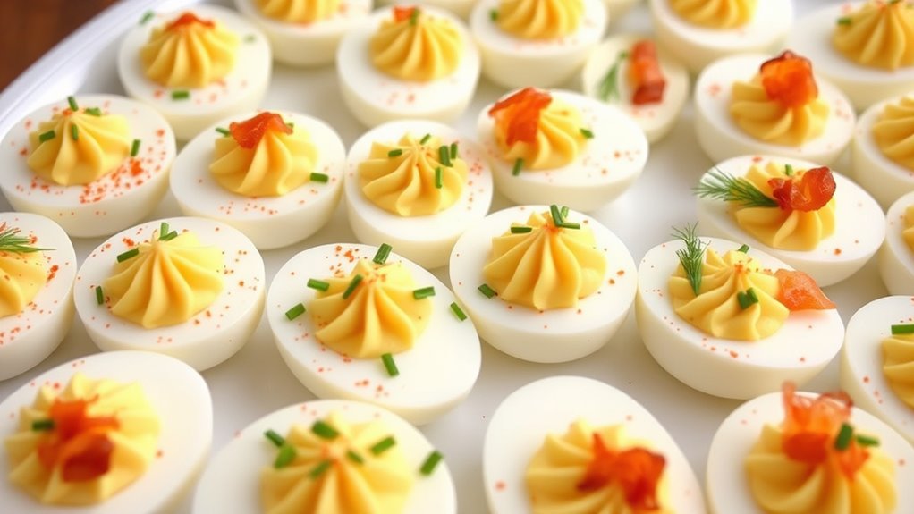 Adding a creative layer to your deviled eggs doesn’t mean losing the simplicity that makes them popular. Instead, it’s about balancing bold flavors with appealing presentation. You might spoon a dollop of guacamole on top for a Mexican-inspired version or sprinkle some crispy pancetta or prosciutto for a savory, salty crunch. Incorporating seasonal toppings and international flavors allows you to customize your deviled eggs for any holiday or gathering, from elegant Christmas parties to lively summer barbecues. The key is to think outside the box, blending ingredients creatively while keeping the preparation straightforward. With a bit of experimentation, you can craft a variety of deviled eggs that surprise and delight, elevating this classic appetizer to new culinary heights for every occasion. Additionally, considering presentation techniques can make your deviled eggs even more appealing and festive.