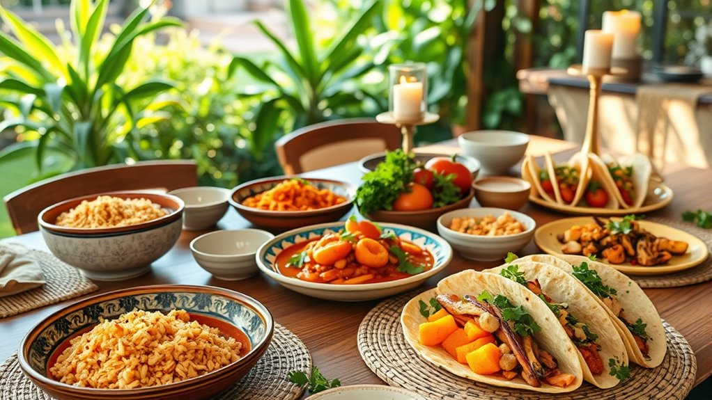 Transform your Thanksgiving into a fusion feast by incorporating international ingredients and flavors into your meal. Experiment with Asian spices, tropical fruits, or Mediterranean herbs to add exciting twists to traditional dishes. Balancing authenticity with creativity allows you to honor diverse culinary traditions while creating memorable flavors. By blending global influences, you turn a classic celebration into an exploration of cultural diversity. Keep exploring to discover inspiring ideas for making your holiday truly international and unforgettable.