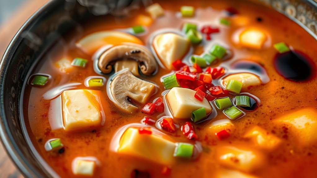 Chinese hot and sour soup is a perfect spicy winter warmer that energizes and comforts you. Its rich, tangy flavor is balanced with heat from ingredients like Sichuan peppercorns, vinegar, and ginger, making it a restorative classic. Variations include ingredients like tofu, bamboo shoots, and mushrooms, reflecting regional tastes. Understanding its history and diverse flavors can deepen your appreciation. If you keep exploring, you’ll uncover even more about this beloved dish’s rich cultural background and unique adaptations.