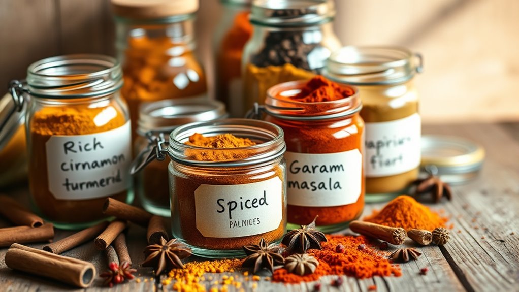 Creating your own spice blends at home is a simple and rewarding way to elevate your cooking. When you make your own blends, you gain control over flavor combinations, ensuring each dish has the perfect balance of spices. Plus, it’s easier to customize blends to suit your taste preferences or dietary needs. Whether you’re preparing a warm pumpkin pie or a savory curry, crafting your own spice mixes allows you to add depth and complexity that store-bought options often lack. To keep your spice blends fresh and flavorful, proper spice storage is essential. Store your homemade mixes in airtight containers away from direct sunlight, heat, and humidity. This helps preserve their aroma and potency, so every sprinkle delivers maximum flavor.