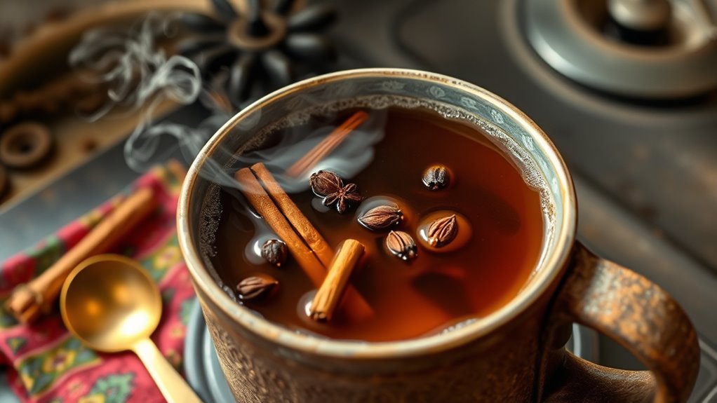 To brew authentic masala chai at home, start by selecting a robust black tea like Assam or Darjeeling. Toast and grind warm spices such as cinnamon, cardamom, cloves, and ginger to enhance flavor. Combine the spices with tea leaves in a pot, then add water and milk, simmering for a few minutes to meld the flavors. Sweeten to taste and strain before serving. Keep exploring the process to create the perfect cup tailored to your taste.