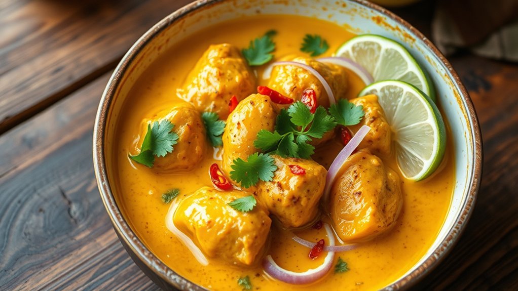 You can make the curry vegan-friendly by swapping chicken with plant-based substitutes like tofu, tempeh, or chickpeas, which are excellent vegan protein options. Investigate how these options absorb flavors and maintain texture, enhancing your dish. Use coconut milk instead of dairy, and guarantee your spices are vegan. These swaps not only keep the authentic taste but also add nutritional value, making your curry both delicious and plant-based.