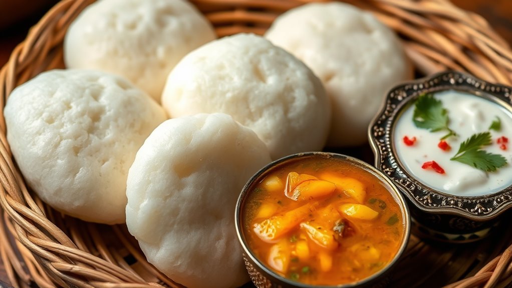 South Indian cuisine features iconic dishes like idli, sambar, and coconut chutney. Idli are soft, steamed rice cakes made from fermented batter, while sambar is a spicy, tangy lentil stew with vegetables. Coconut chutney offers a cool, creamy complement to these flavors. These dishes showcase traditional fermentation, spices, and fresh ingredients that have been passed down through generations. Exploring more will reveal the rich culinary artistry behind these beloved staples.