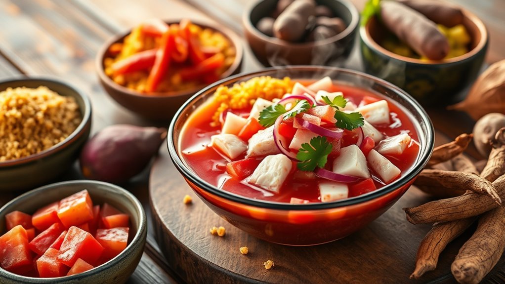 Peruvian cuisine is known for its vibrant flavors and diverse ingredients rooted in history and geography. You’ll find superfoods like potatoes, quinoa, and amaranth, which offer health benefits and nutrient density. Amazonian ingredients such as camu camu and açaí add antioxidants and vitamins, enhancing both flavor and wellness. These ingredients reflect a strong tradition of natural, minimally processed foods. Keep exploring to discover more about the rich and nutritious world of Peruvian superfoods.