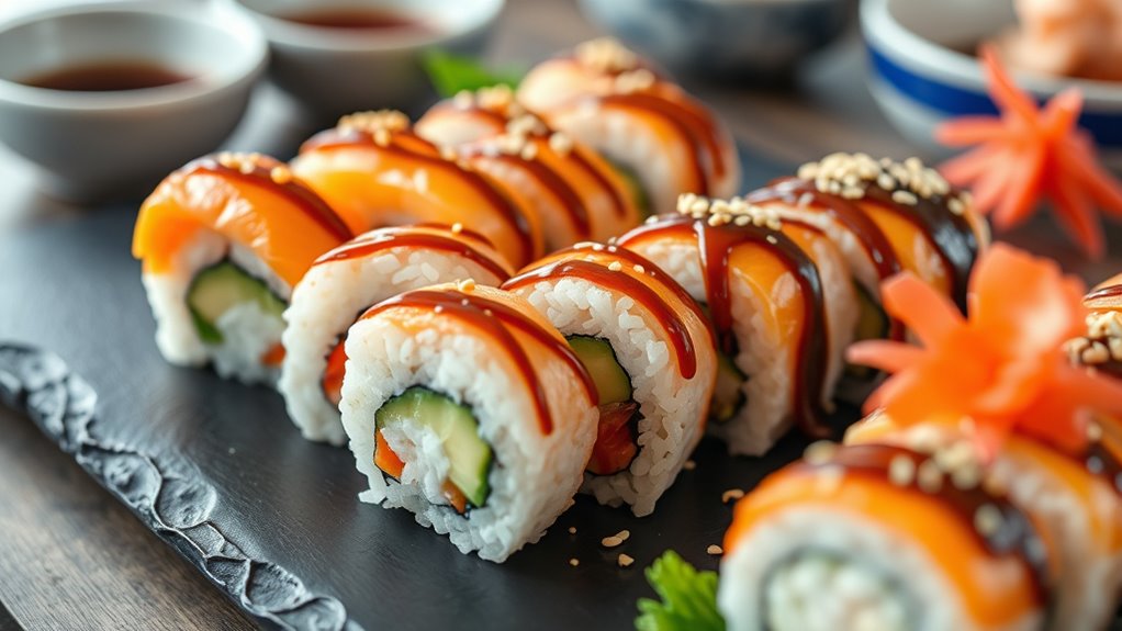 You can explore a variety of sushi rolls beyond the basics, like fusion rolls that combine different cuisines and regional varieties that highlight local ingredients and flavors. Fusion rolls might include spicy tuna or avocado, blending traditions creatively. Regional varieties, such as Osaka-style or Hokkaido-style rolls, showcase unique ingredients and techniques. Trying these options adds excitement to your sushi experience and helps you appreciate the diverse culinary landscape of Japanese sushi.