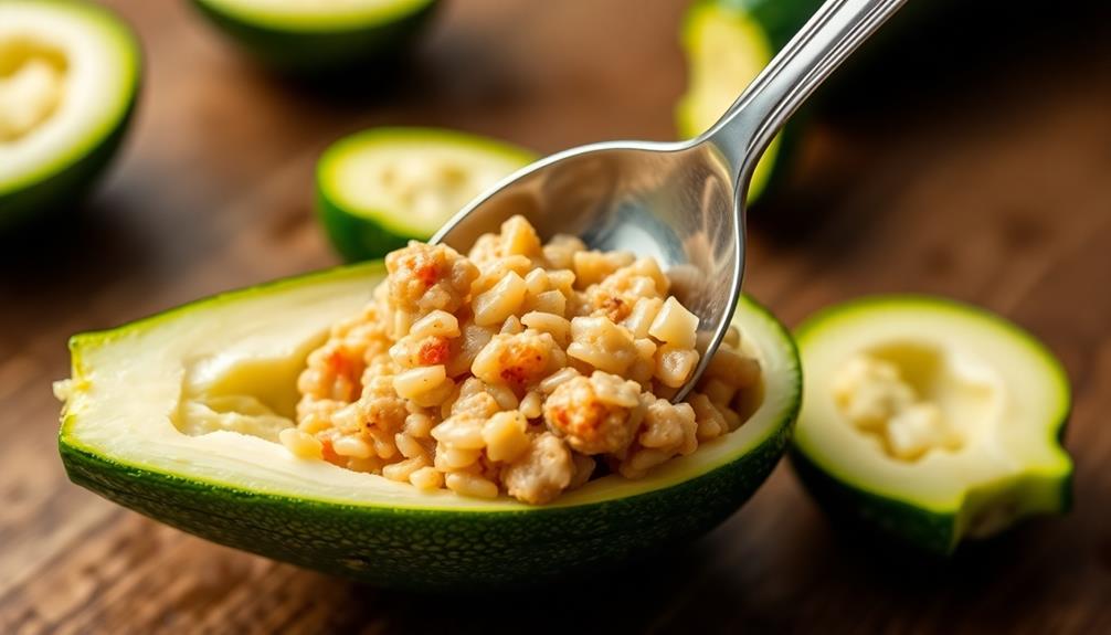 You'll need to carefully scoop out the centers, make the tasty filling, and gently stuff the zucchini.