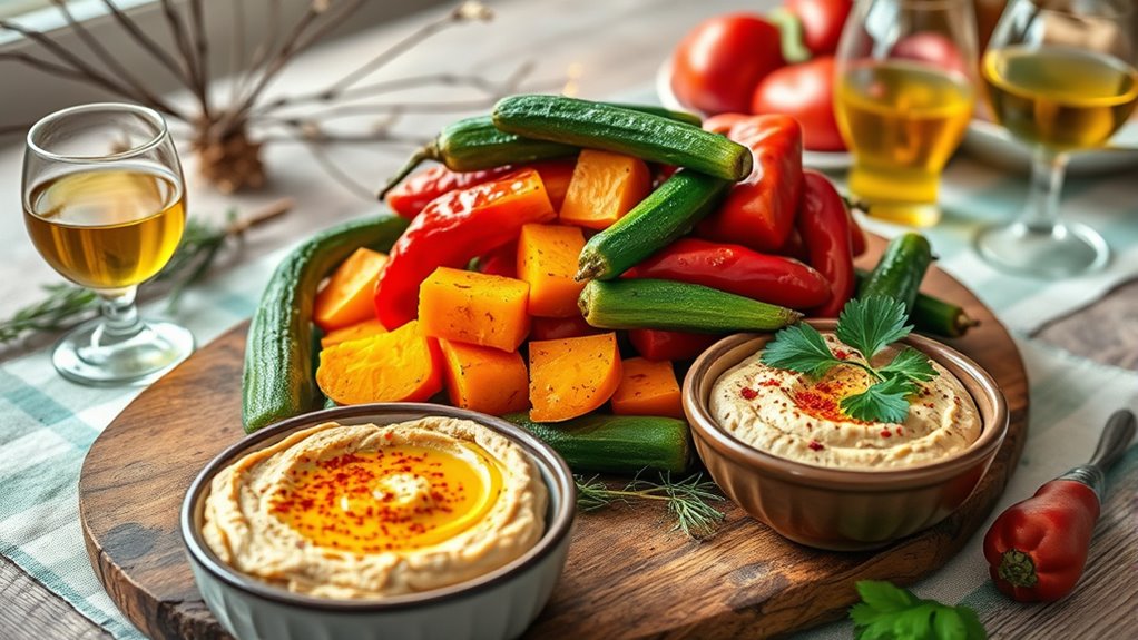 In winter, embrace the Mediterranean diet with hearty recipes that highlight seasonal produce like root vegetables, leafy greens, and citrus fruits. Use warming spices such as cinnamon, nutmeg, and paprika to add flavor and health benefits. Simple dishes like roasted vegetables, hearty stews, and fresh herb salads work beautifully, providing nourishing, flavorful meals. Continuing will reveal inspiring ideas to keep your winter diet vibrant, healthy, and satisfying.
