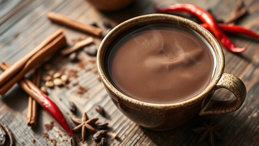 Next time you enjoy a warm cup of Mexican chocolate caliente, remember the rich history behind its spices. Imagine sipping it with a friend during a cool evening, feeling comforted by flavors rooted in centuries of tradition. For example, a family in Oaxaca might pass down their secret blend, connecting generations through every sip. So, next time, appreciate not just the taste but the story and culture infused in each spicy, chocolaty sip.