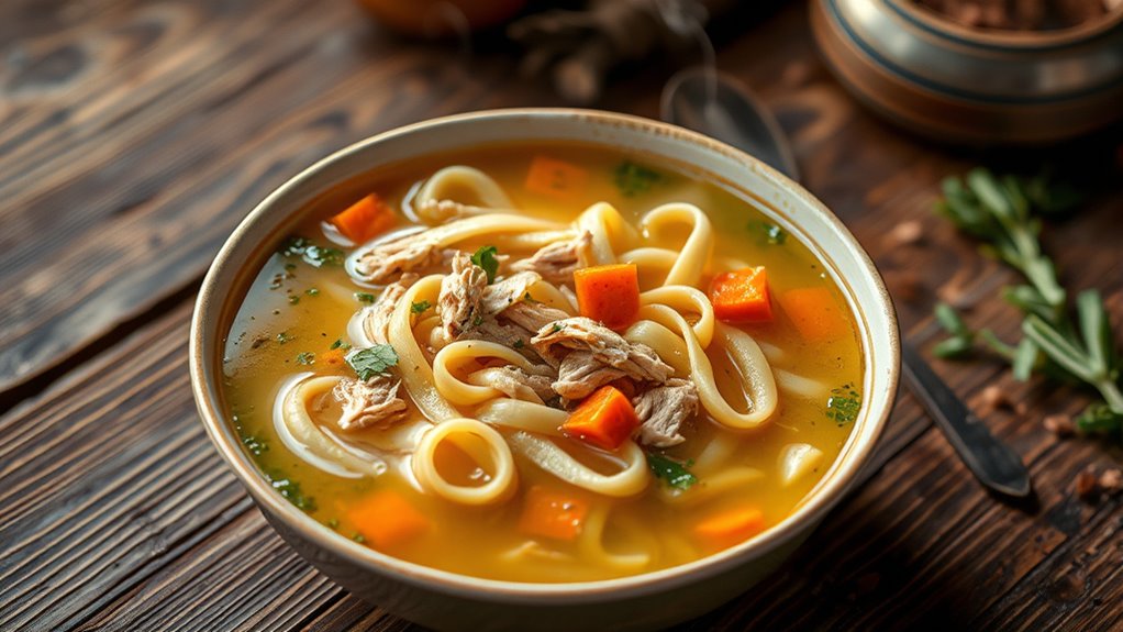 When the cold winter months settle in, nothing beats a warm, comforting bowl of one-pot chicken noodle soup. Making this classic dish from scratch allows you to control every ingredient, guaranteeing it’s both nourishing and flavorful. Start by preparing your own homemade broth; it’s the foundation that makes your soup truly special. Using homemade broths means you skip the preservatives and artificial flavors often found in store-bought options. Simmer chicken bones, aromatic vegetables, and herbs for hours to extract rich, deep flavors. This slow process yields a clear, savory broth that elevates the entire dish, making it more satisfying and wholesome.