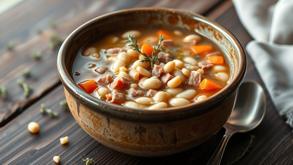 To start, you’ll want to gather your ingredients: leftover ham, dried beans or canned beans, vegetables like onions, carrots, and celery, garlic, broth, and seasonings. The beauty of this recipe lies in its flexibility; if you don’t have certain vegetables, you can swap in others like potatoes or spinach. For the beans, canned ones cut down on prep time, but if you prefer dried beans, soak them overnight for quicker cooking. When it comes to cooking techniques, sautéing the aromatics first helps release their flavors, creating a rich base for your soup. You can use a little oil or butter to soften the onions, carrots, and celery until tender. Then, add garlic and cook for another minute until fragrant.