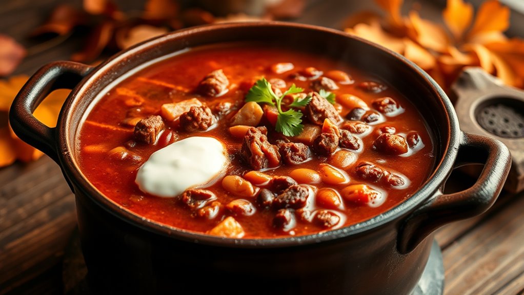 For a hearty one-pot chili perfect for chilly fall nights, start by browning your choice of ground meat or plant-based protein. Add canned tomatoes, beans, spices like cumin and smoked paprika, and a bit of chili pepper for heat. Let everything simmer until flavors meld and the chili thickens. This easy, customizable dish keeps your cleanup minimal and warms you from the inside out. Keep going to discover tips that make your chili even better.