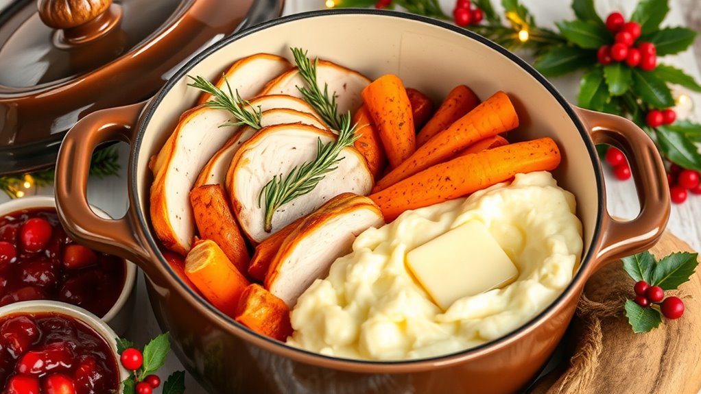 A one-pot holiday meal simplifies your Christmas dinner by combining flavors, saving you time, and lessening cleanup. With a single dish, you can create hearty, festive flavors that meld beautifully during cooking, letting you focus more on your guests. It also frees up oven and stove space for other treats. Plus, cleanup is quick and easy, so you can relax and enjoy the celebration. Learn more ways to make your holiday meal stress-free and delicious.