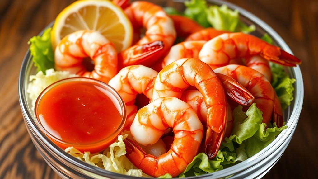 Starting with the shrimp itself, the key to a great shrimp cocktail begins with choosing fresh, high-quality seafood. You want shrimp that are firm and have a clean, briny aroma. Cooking techniques matter here; boiling or steaming are the most common methods for preparing shrimp for cocktails. These gentle techniques preserve the delicate texture of the seafood while preventing overcooking, which can make shrimp rubbery. Once cooked, you’ll want to chill the shrimp thoroughly, often in ice water, to enhance their firm texture and keep them cold for serving. Properly prepared shrimp serve as the perfect canvas for your sauces, highlighting their natural sweetness.