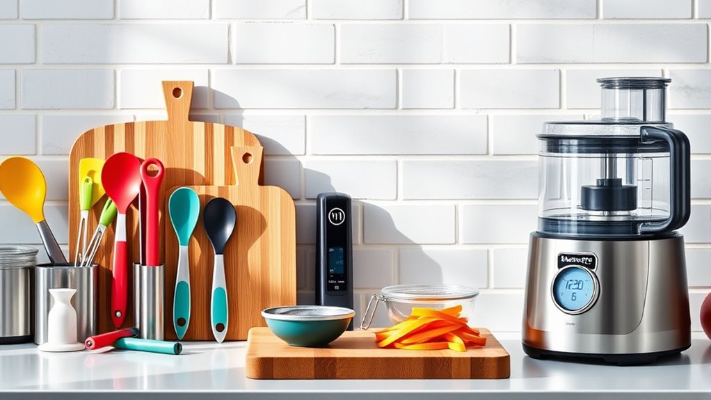Think of your new kitchen tools like a garden — regular care keeps them thriving. To maintain and clean them effectively, follow proper cleaning techniques and maintenance tips. Wash gadgets promptly after use, avoid abrasive scrubbers, and dry thoroughly. For stubborn stains, soak or use gentle cleaners. Regularly inspect for damage, and store tools properly. This routine guarantees your tools stay sharp, safe, and ready for your next culinary adventure.