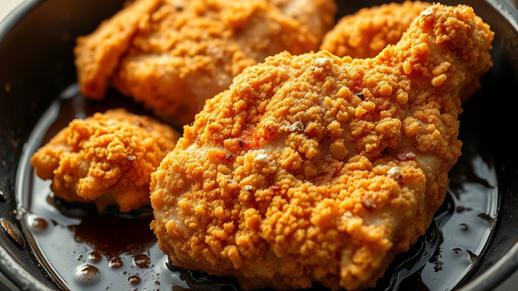 For the crispiest fried chicken, you should choose oil with a high smoke point like peanut or vegetable oil. These oils withstand high frying temperatures without burning, ensuring a crispy exterior. Maintain a frying temperature of around 350°F to 375°F for perfect results. Proper oil selection and consistent frying temperature are key to achieving that golden, crunchy coating everyone loves.
