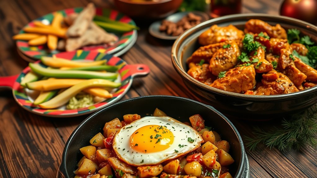 After Christmas, get creative with your leftovers by turning ham into a hearty hash or turkey into a flavorful curry. Chop and sauté vegetables with your meats for quick, satisfying breakfasts or dinners. These recipes help reduce waste while giving new life to familiar ingredients. With simple techniques, you can enjoy delicious, budget-friendly meals that make post-holiday cleanup more enjoyable. Keep exploring to discover more exciting ways to use your leftovers!