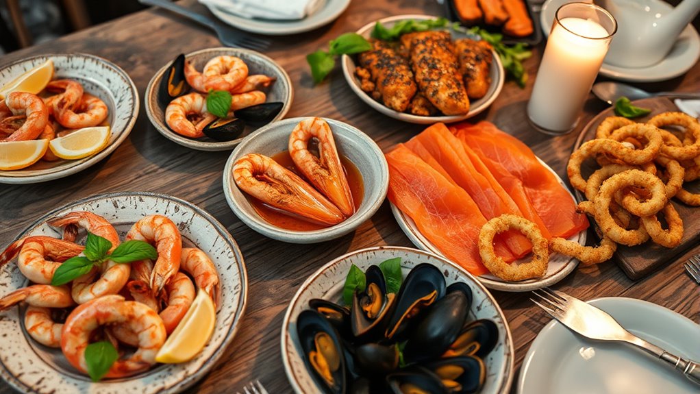 For traditional Italian dishes, you’ll want seafood pairing that enhances the flavors. Opt for light, delicate options like clams, mussels, and calamari to complement pasta or risotto. Shrimp and scallops also work beautifully in baked or sautéed dishes. Keep the seafood fresh and simple—garlic, olive oil, and herbs will bring out authentic Italian flavors. These choices guarantee a harmonious balance with your classic dishes, making your meal memorable.