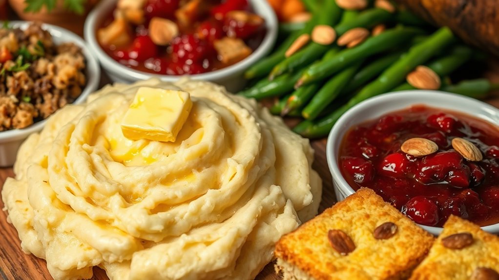 Think vegan mashed potatoes are bland? Think again! You can make them dairy-free by using plant-based milk like almond or coconut milk, and coconut cream for richness. Add flavor enhancements like roasted garlic, nutritional yeast, or fresh herbs to boost taste. These alternatives give you creamy, delicious mashed potatoes without dairy, proving you don’t have to sacrifice flavor for vegan options. Who says Thanksgiving can’t be both compassionate and tasty?