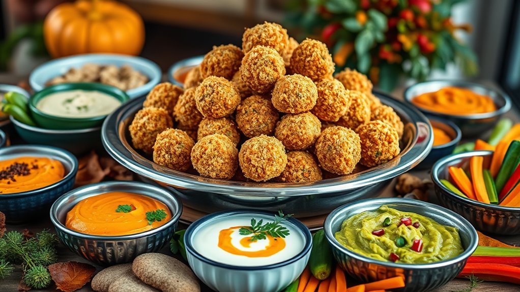 To impress guests this Thanksgiving, focus on vibrant, shareable appetizers like creatively shaped cheese balls coated with herbs, nuts, or edible flowers, and layered dips served in charming jars or hollowed vegetables. Use colorful garnishes and varied textures to create eye-catching displays that encourage mingling. Incorporate fun presentation ideas like rustic boards or sleek platters. Keep exploring for more inspiring tips to elevate your holiday spread and truly wow your guests.