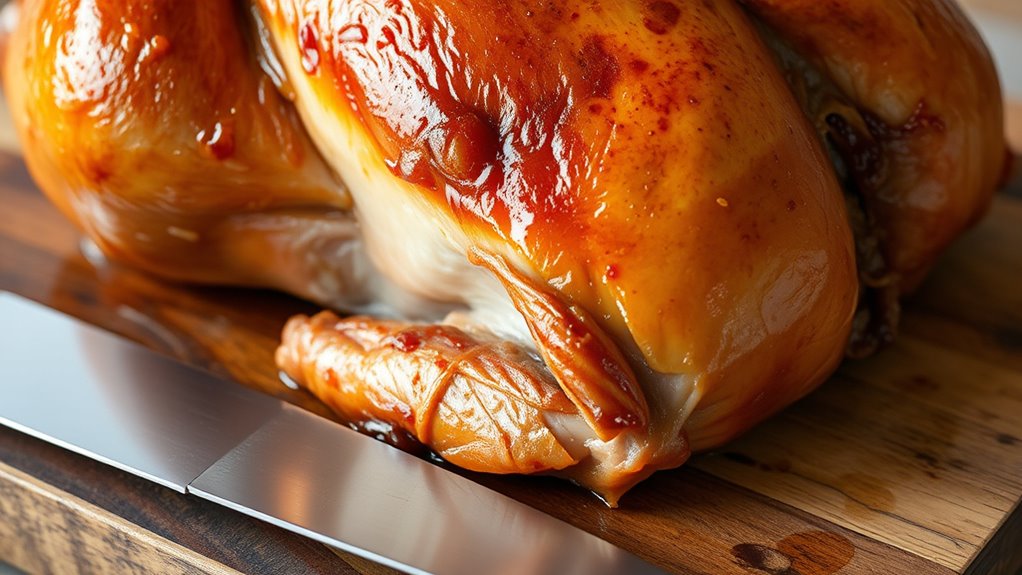 When it comes to carving techniques, proper execution can make all the difference in presentation and juiciness. After resting your turkey for at least 20 minutes, transfer it to a carving board. Use a sharp carving knife and a sturdy fork to stabilize the bird. Start by removing the legs and thighs, then slice the breast meat against the grain for tender slices. If you notice your turkey is dry, it’s likely overcooked or not rested enough. To prevent dryness, baste the bird periodically during roasting, or cover it with foil if it’s browning too quickly. Resting is vital—don’t skip it. It allows juices to redistribute, resulting in more flavorful, moist slices. When carving, aim for clean, even slices rather than tearing the meat apart; this preserves the bird’s moisture and makes for an elegant presentation.