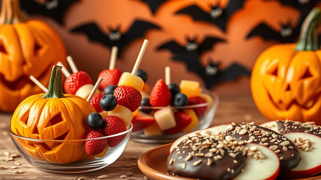 You can make budget-friendly healthy treats by choosing cost-effective snacks like fresh fruit, popcorn, or homemade trail mix. Use DIY ingredient swaps, such as Greek yogurt instead of sour cream or honey instead of sugar, to cut costs while keeping treats nutritious. Shop sales and buy in bulk to save more. These simple swaps help you create delicious, healthy Halloween snacks without breaking the bank.