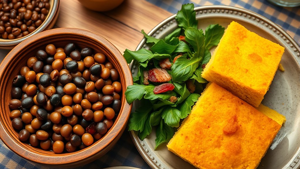You can still enjoy these traditions with some clever swaps. Try gluten-free options for black-eyed peas and greens, like lentils or collard greens seasoned just right. For a vegan twist on cornbread, use plant-based milk and egg substitutes such as flaxseed or applesauce. These gentle modifications let you partake in the celebration without compromising your dietary needs, making the festivities inclusive and delicious.