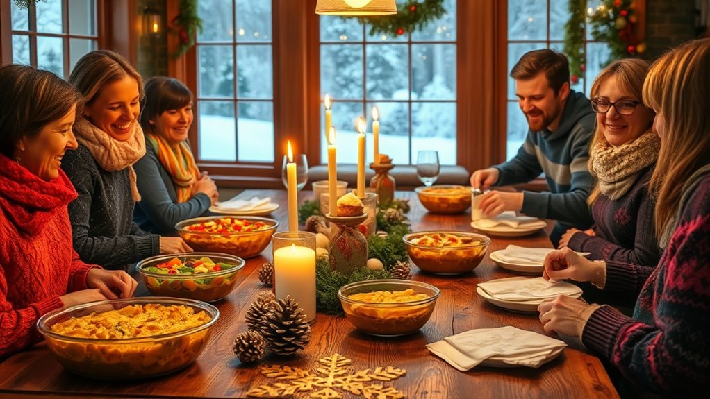 Think of your potluck as a warm, welcoming tapestry—layered with diverse flavors. To accommodate dietary restrictions, offer gluten-free options and vegan-friendly dishes that everyone can enjoy. Label each dish clearly, so guests know what’s safe for them. Encourage sharing of favorite recipes and be open to adjusting recipes to suit various needs. This thoughtful approach guarantees your gathering feels inclusive, like a cozy hug in winter’s chill.