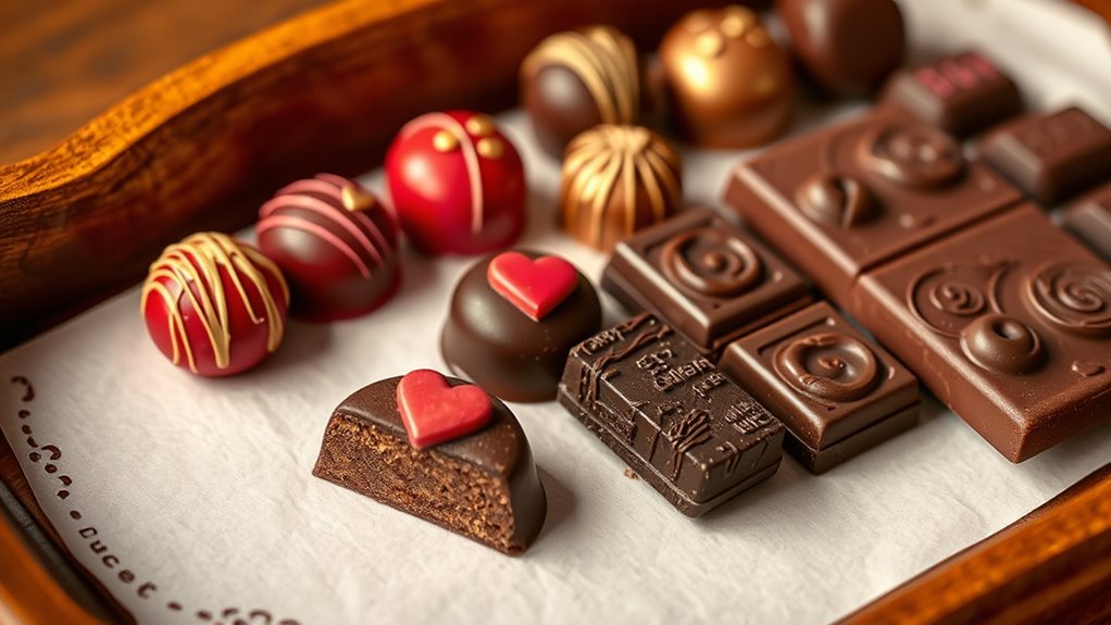 Looking for a sweet way to celebrate Valentine’s Day? Making your own chocolates can be a heartfelt gesture that shows how much you care. Whether you’re creating filled bonbons or homemade bars, the process lets you get creative with wrapping techniques and flavor combinations, making each piece uniquely special. When you start, think about how you want to present your chocolates; the wrapping techniques you choose can elevate the entire gift. You might opt for elegant foil wrapping, decorative paper, or clear cellophane bags tied with ribbons. These little touches add a polished look and make your chocolates feel more luxurious. Playing with different wrapping styles also allows you to personalize your gift—perhaps with handwritten notes or small charms that reflect your loved one’s personality. As you plan your chocolates, consider how flavor combinations can turn simple ingredients into extraordinary treats. Combining rich dark chocolate with hints of sea salt, caramel, or chili pepper creates a complex taste experience. Alternatively, pairing milk chocolate with fruity accents like raspberry or orange zest can add freshness and vibrancy. For a more indulgent touch, you might fill bonbons with ganache infused with coffee or liqueurs such as Grand Marnier or Chambord. When working with filling, precision matters; use a piping bag or a small spoon to fill each mold carefully, ensuring that your flavor layers are distinct and well-distributed. Once filled, sealing the chocolates with a top layer of chocolate requires patience but pays off in the end. Tempering your chocolate properly results in a glossy finish and a satisfying snap when bitten into. Properly changing gears on your equipment is also essential for working efficiently and avoiding mishaps. When it comes to wrapping your finished chocolates, think about how to preserve freshness and enhance visual appeal. Double-wrap delicate bonbons in tissue paper before placing them in decorative boxes or tins. For bars, consider wrapping each segment individually in wax paper or foil, then bundling them together in a pretty gift box. Incorporate your favorite flavor combinations into the packaging, like adding a small card describing the taste profile or pairing chocolates with complementary items such as a bottle of wine or a bouquet of flowers. The key is to balance aesthetics with taste, making your homemade chocolates not just delicious but also a memorable gift. With attention to wrapping techniques and flavor pairings, your DIY chocolates will surely impress anyone lucky enough to receive them, turning a simple act of confectionery into a touching expression of love.