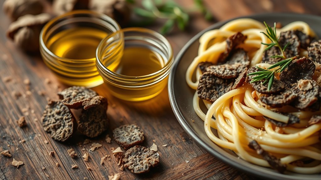 Now that you know how to elevate your dishes with truffles and truffle oil, remember—these gems are like culinary treasures waiting to transform your cooking. Just as a master painter uses rare colors, you can craft masterpieces with just a touch of truffle. So go ahead, embrace their luxurious aroma and flavor. In the sphere of fine cuisine, you’re now armed to create unforgettable, indulgent moments—like a culinary alchemist turning simple ingredients into gold.