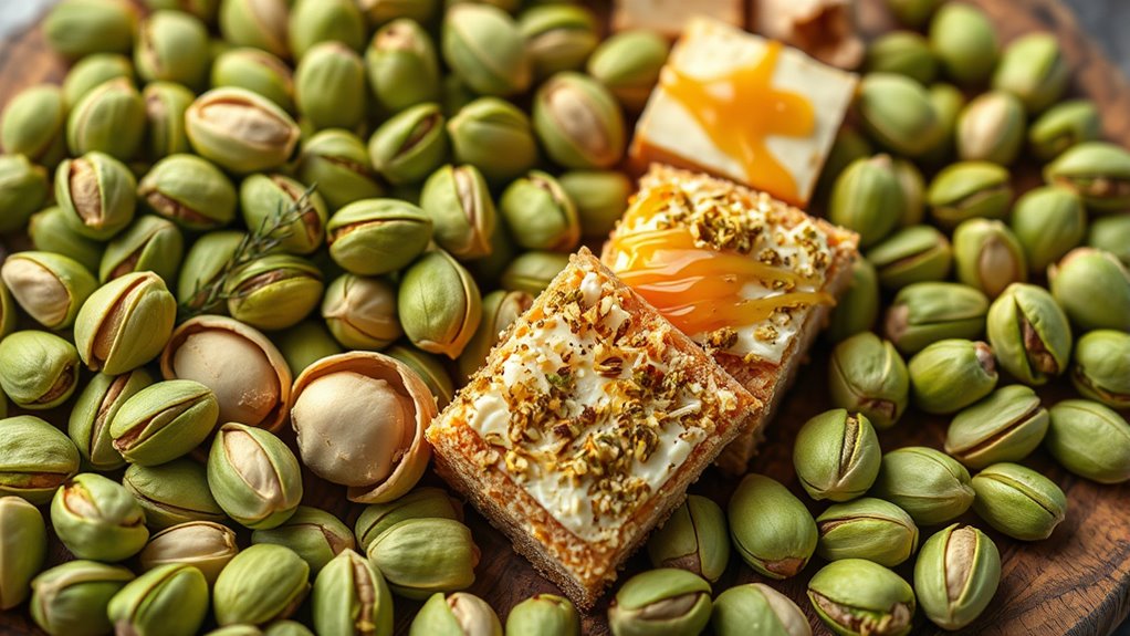 Have you ever wondered what makes pistachios a truly unique ingredient? It’s not just their vibrant green hue or their distinctive crunch that sets them apart; it’s also their impressive health benefits and versatile flavor pairings. Pistachios are packed with nutrients like healthy fats, fiber, protein, and antioxidants, making them a nutritious addition to your diet. Consuming them regularly can support heart health, lower bad cholesterol levels, and promote weight management. Plus, they’re rich in vitamins B6 and E, which aid in immune function and skin health. These health benefits make pistachios more than just a tasty snack—they’re a smart choice for your overall well-being.
