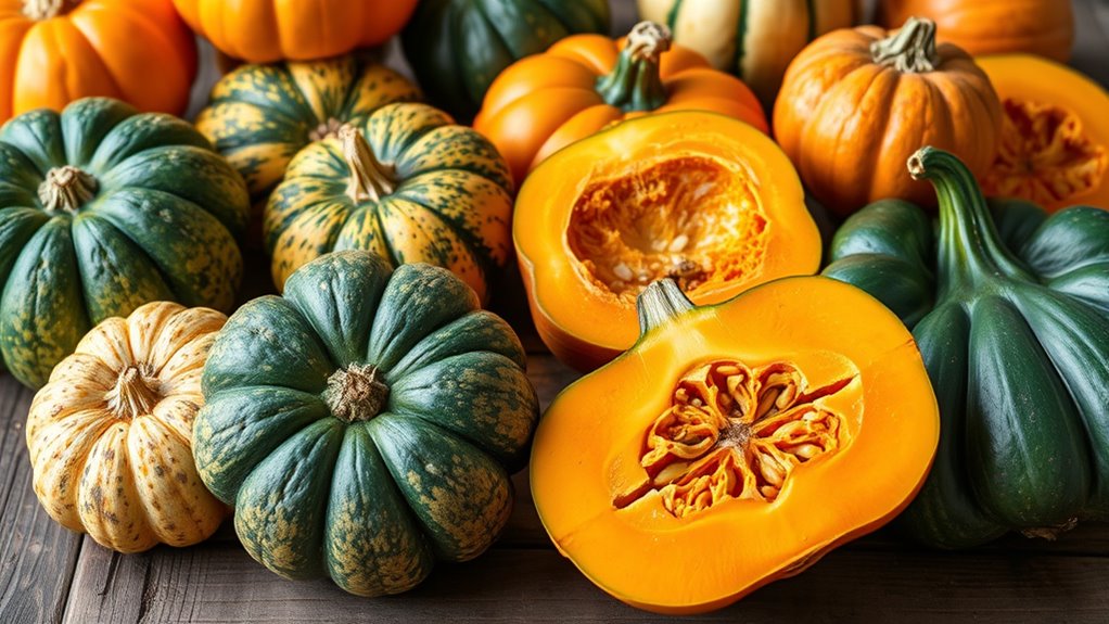 A medley of winter squashes offers a vibrant array of flavors, colors, and textures that can elevate any seasonal meal. When you explore different squash varieties, you reveal a world of culinary possibilities, especially since these seasonal ingredients are at their peak during fall and winter. Each squash type brings its own unique taste and consistency, making your dishes more diverse and exciting. But before you start cooking, it’s essential to understand the characteristics of each variety to maximize their potential. For example, butternut squash has a sweet, nutty flavor and smooth flesh, perfect for purees or roasting. Acorn squash offers a slightly bitter edge with a dense, fibrous texture that holds up well in hearty dishes. Kabocha, often called Japanese pumpkin, is sweet and velvety, ideal for roasting or stuffing. Delicata squash, with its thin, edible skin and sweet flavor, is excellent for roasting whole or slicing into salads. Knowing these differences allows you to select the right squash for your recipe, ensuring you get the best flavor and texture.
