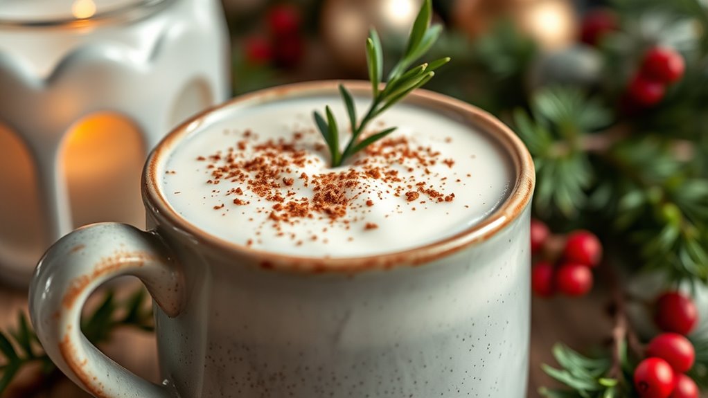 Plant-based “nog,” or vegan eggnog, is trending as more people seek dairy-free holiday drinks. Using nut milks like almond, cashew, or coconut makes for a creamy, festive beverage packed with flavor from vanilla, cinnamon, and nutmeg. It’s perfect for those with dairy sensitivities, allergies, or anyone looking for an eco-friendly choice. Plus, you can easily customize it at home or find ready-made options. Keep exploring to discover delicious recipes and inclusive holiday ideas.